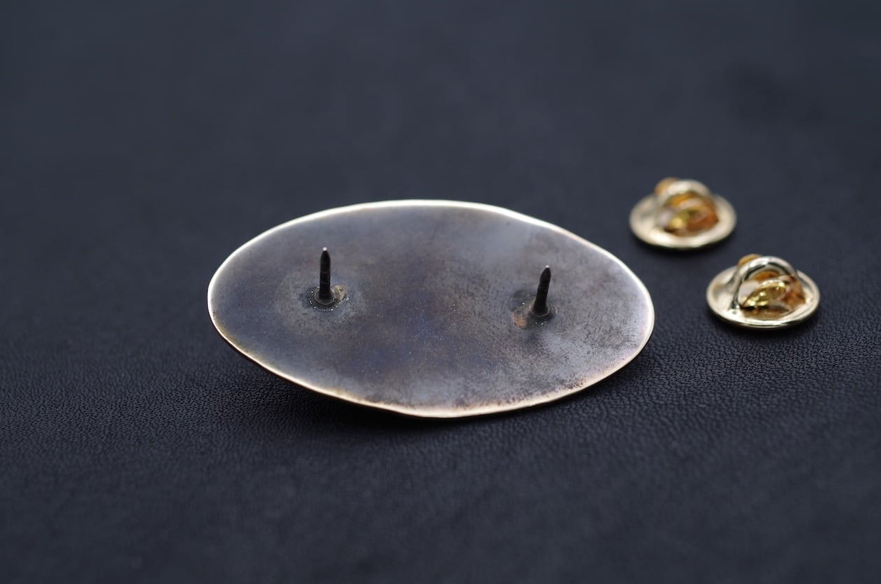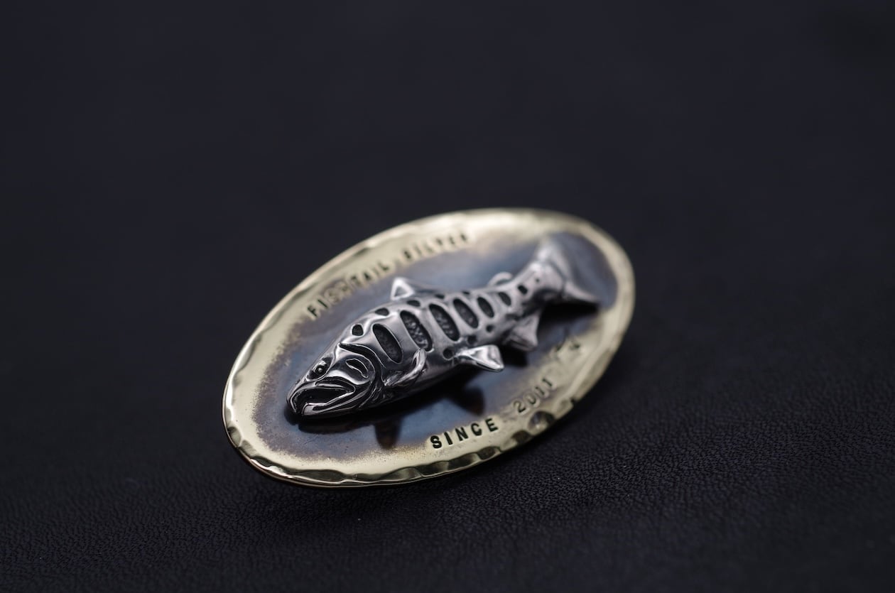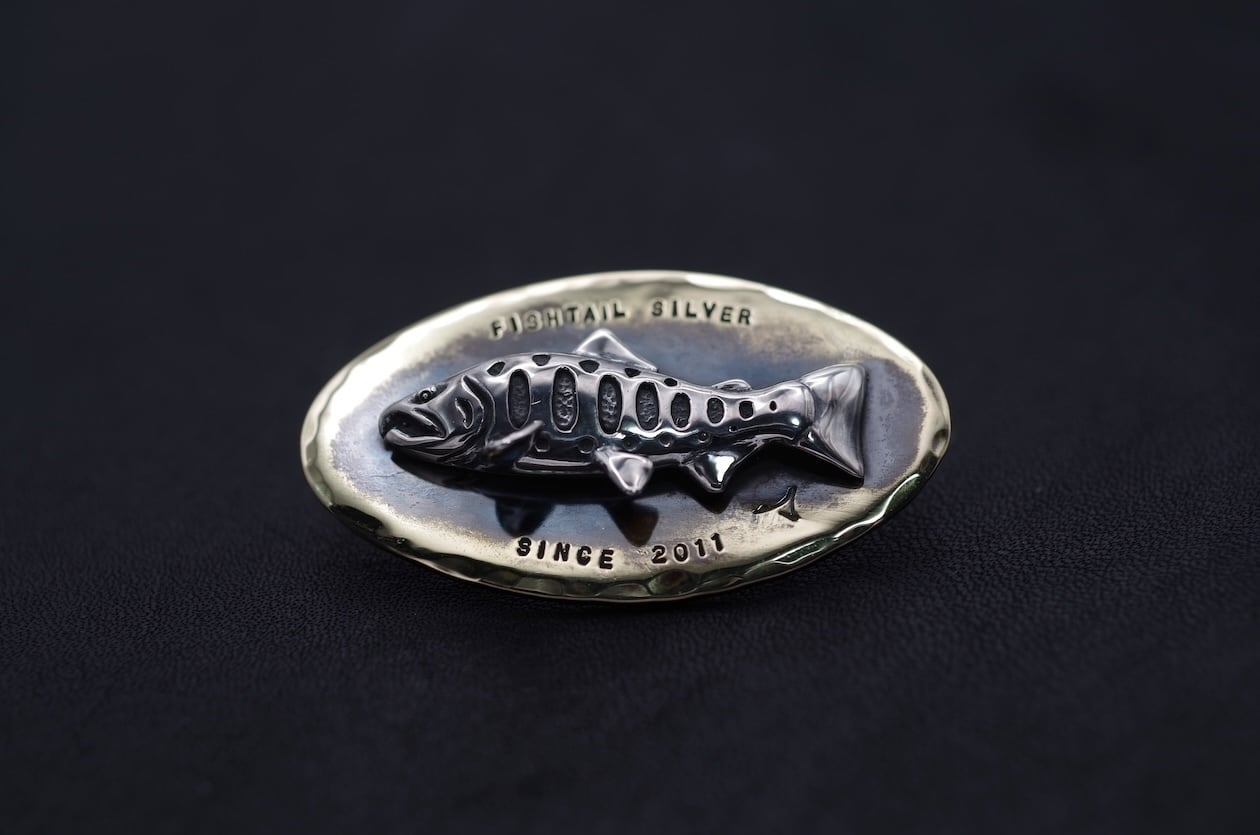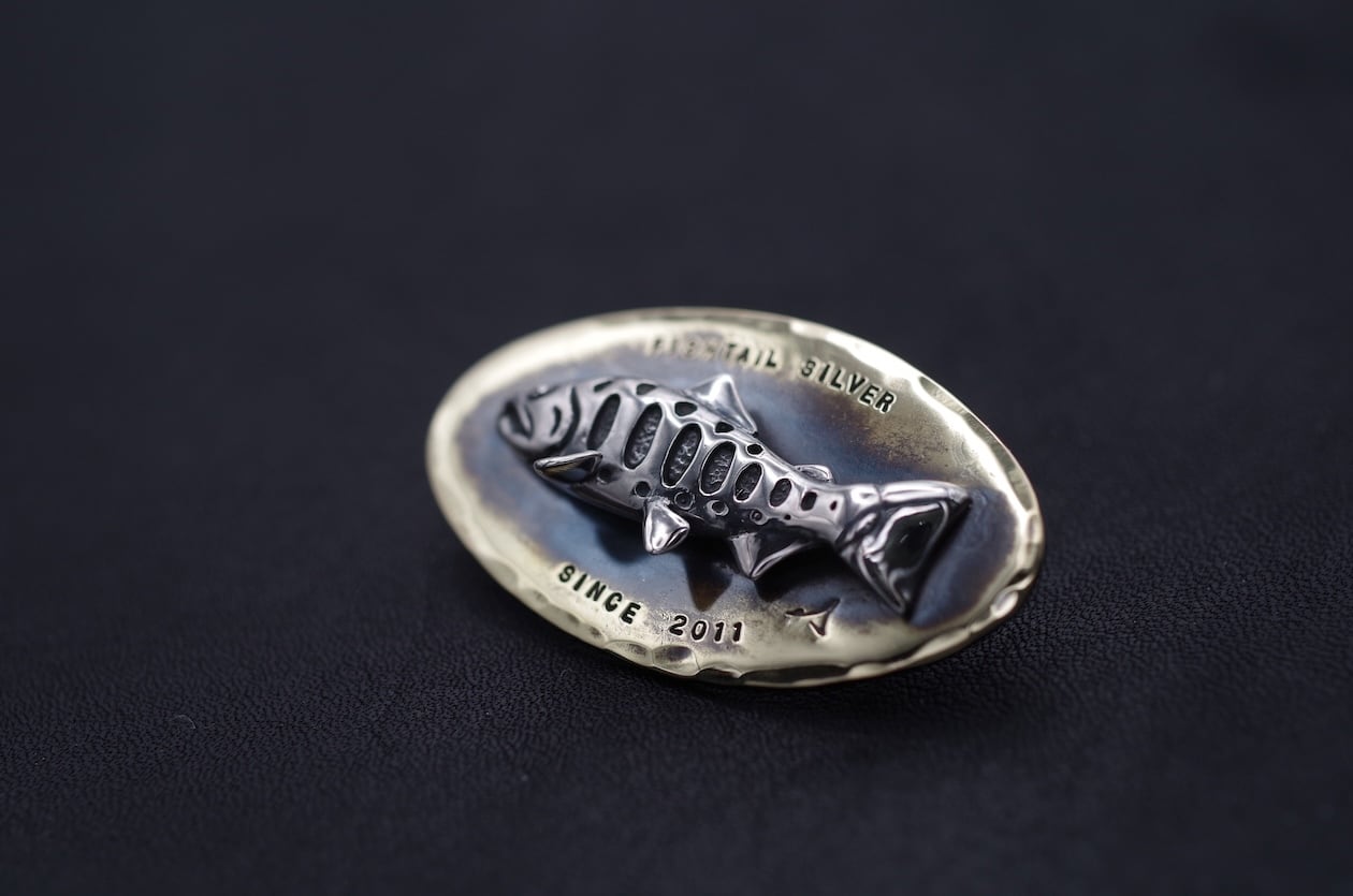 Fishtail Silverスタートのきっかけとなった一作目のヤマメピンズと真鍮プレートを組み合わせる事で立体感を表現し、より豪華にアレンジした限定生産品です。